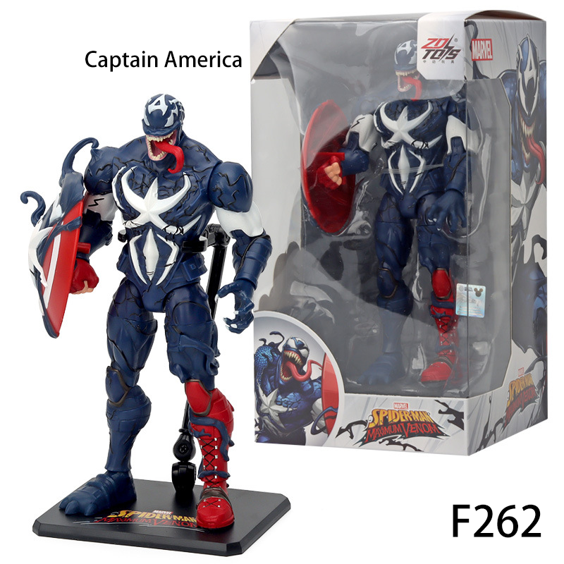 Collectible Marvel Venom Series Avengers figures, featuring Captain America, Black Panther, Iron Man, Thanos, and Spider-Man. Detailed PVC action figures perfect for fans and collectors. Each figure comes in a color box (22×12×12 cm) and weighs approximately 230 g